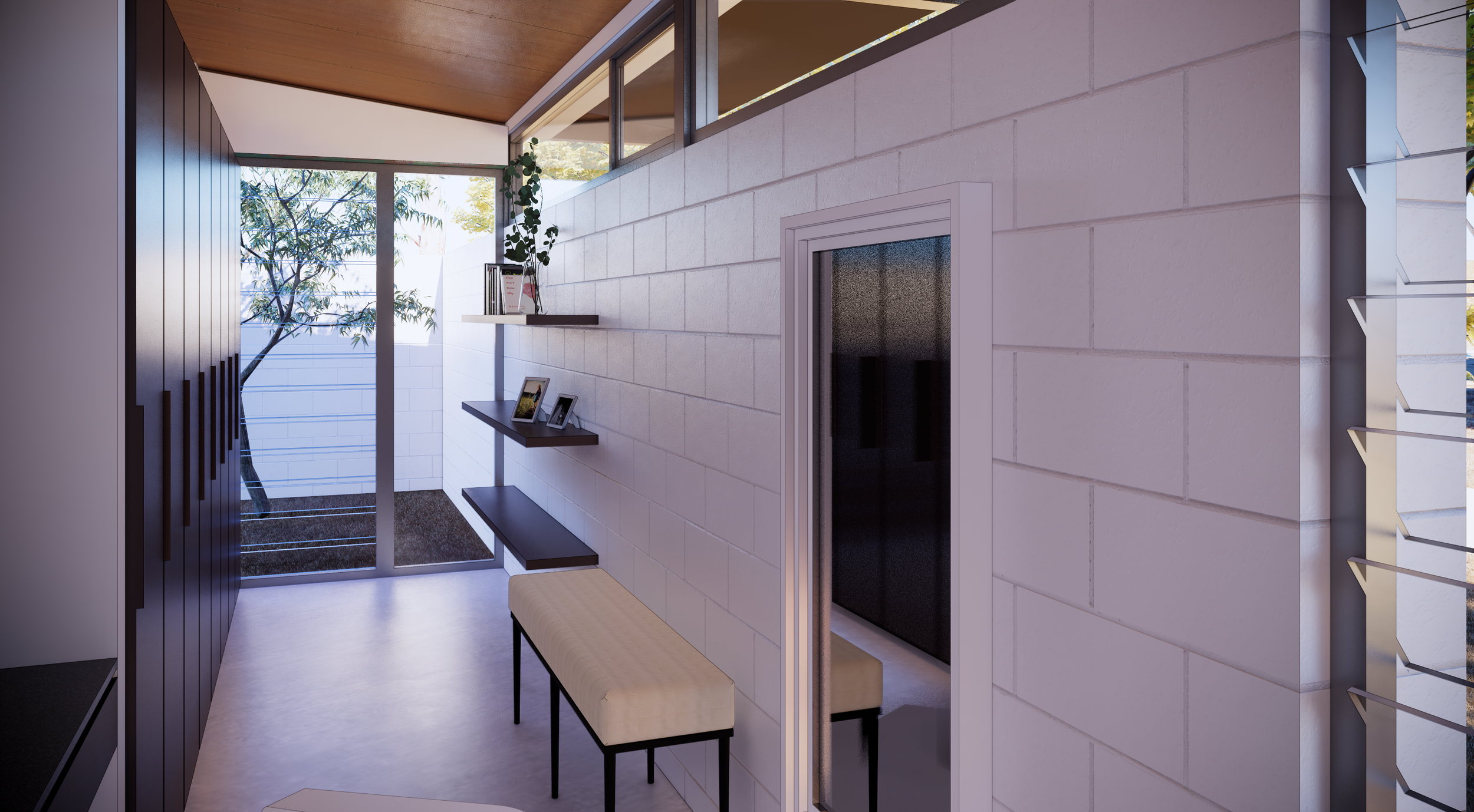 A dramatic skillion roof floats above the pavilion below, making a strong visual statement, and shading external walls in summer. The south elevation is protected from prevailing winds by a masonry wall. This provides privacy from neighbours and the nearby road. It also provides good thermal mass to improve energy efficiency.