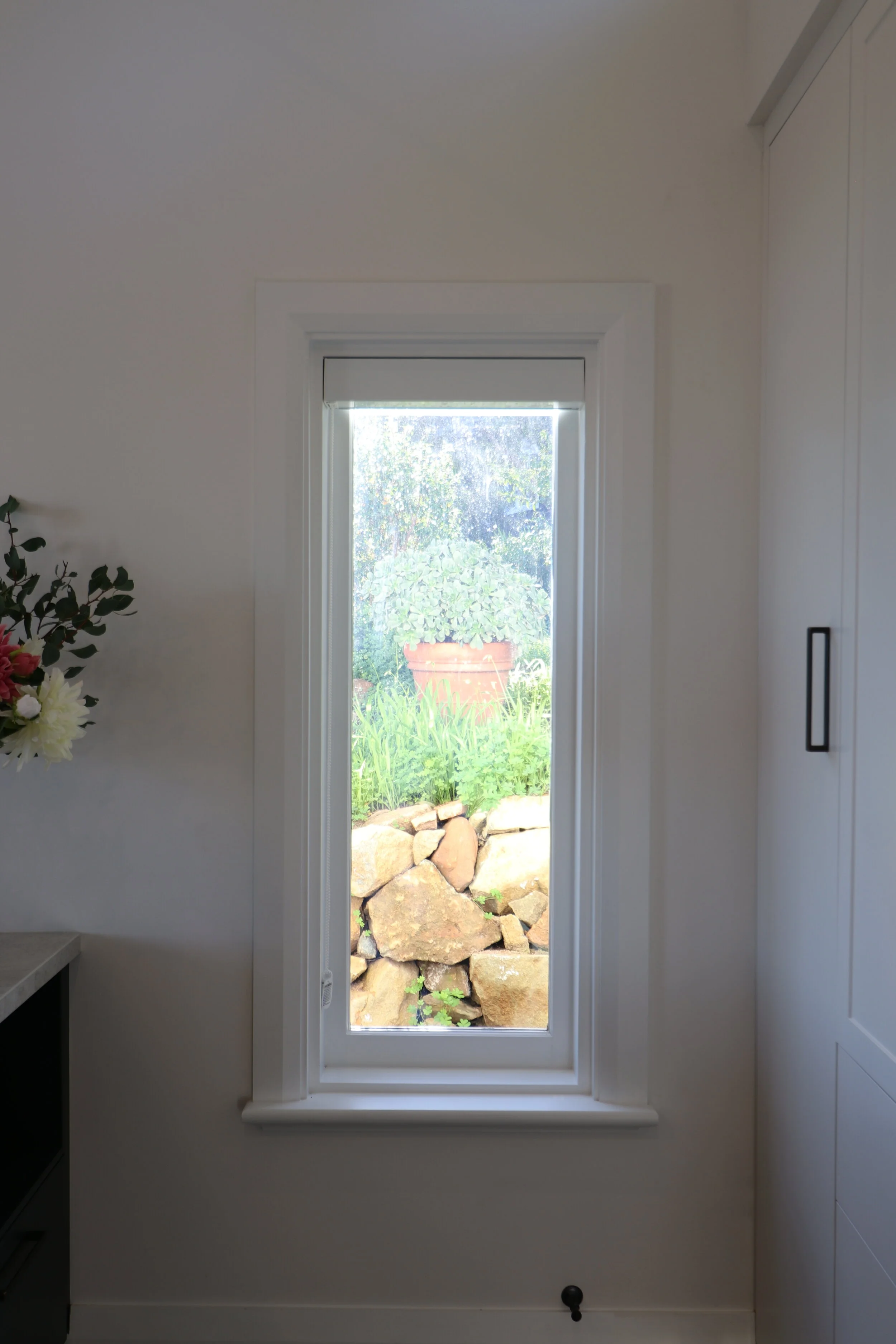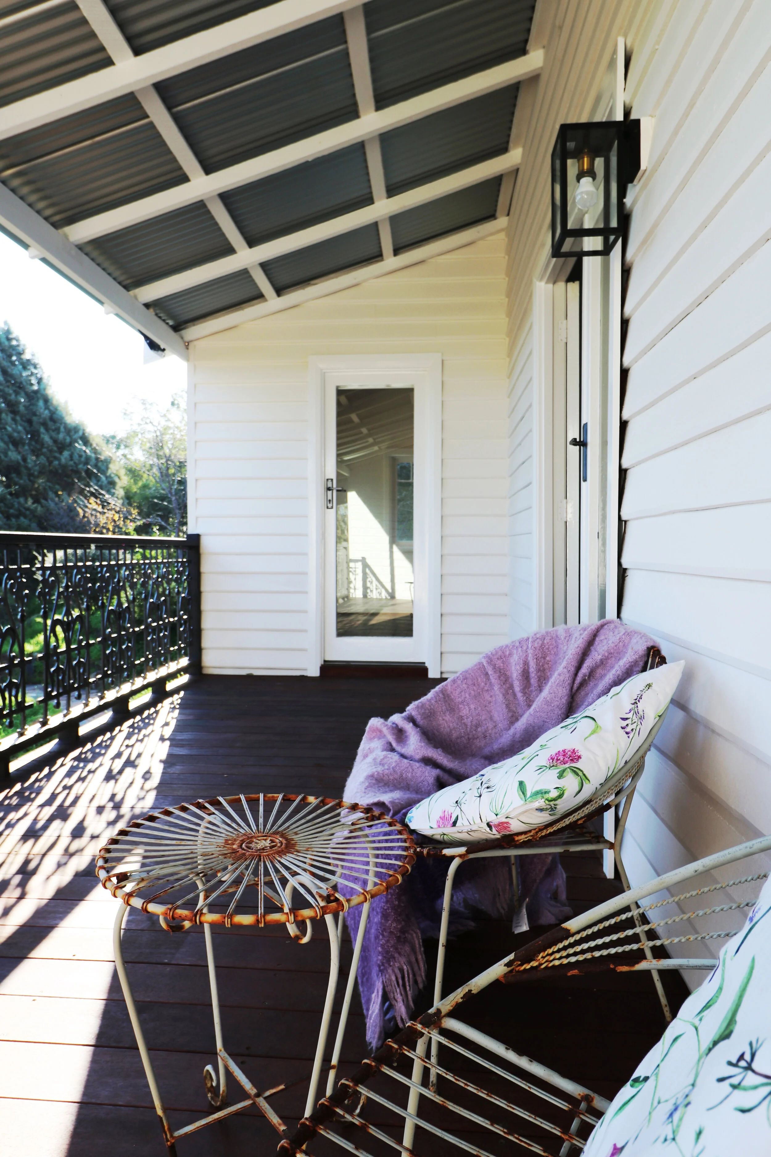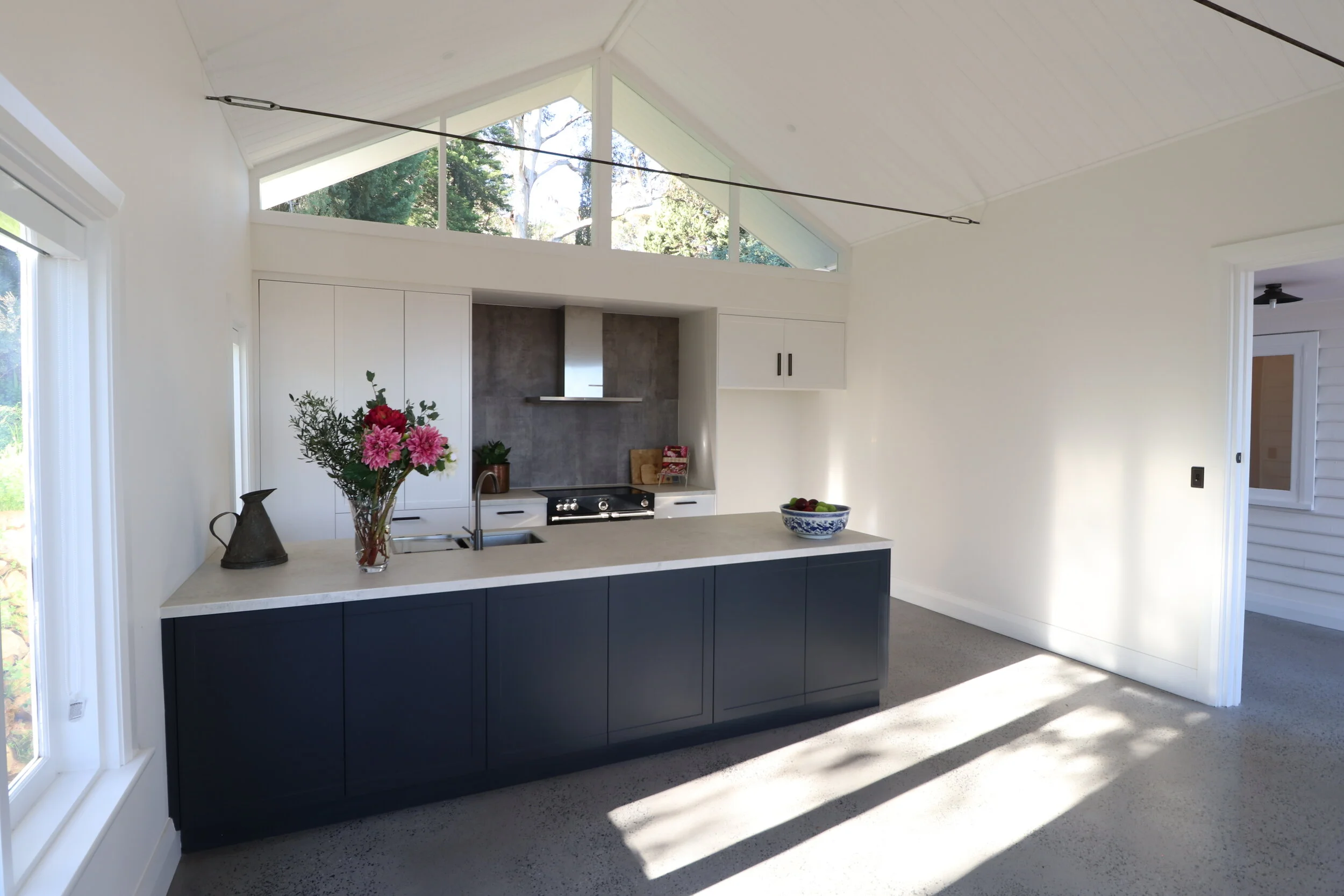 A new addition, contemporary in expression but utilising the language of the old cottage accommodates a modern kitchen and family meals area with honed concrete floors, high raked ceilings, and rod tied trusses. This opens directly onto an outdoor dining space which overlooks the valley and is connected by new stone steps, down the steeply sloping site to the gardens below.