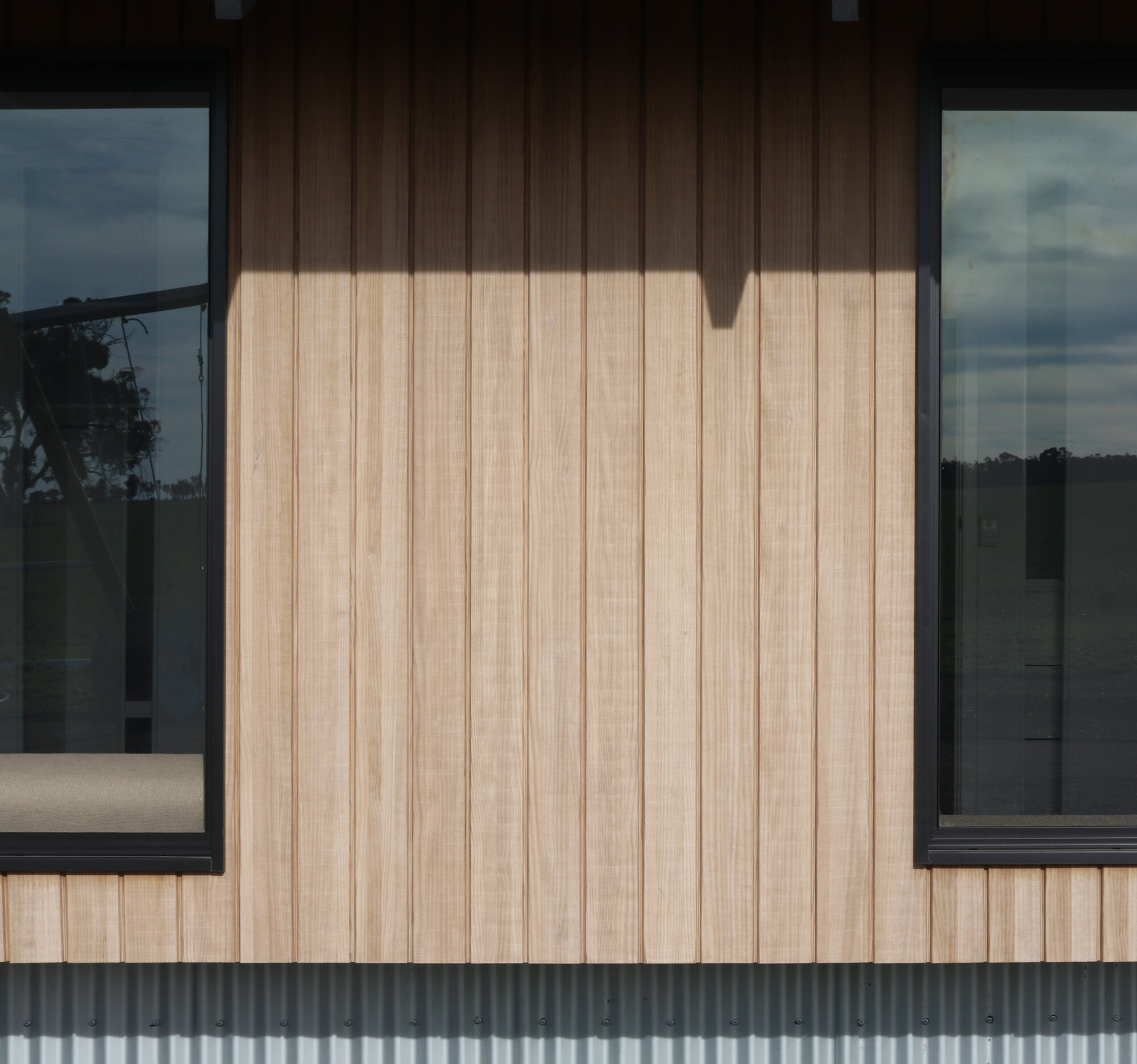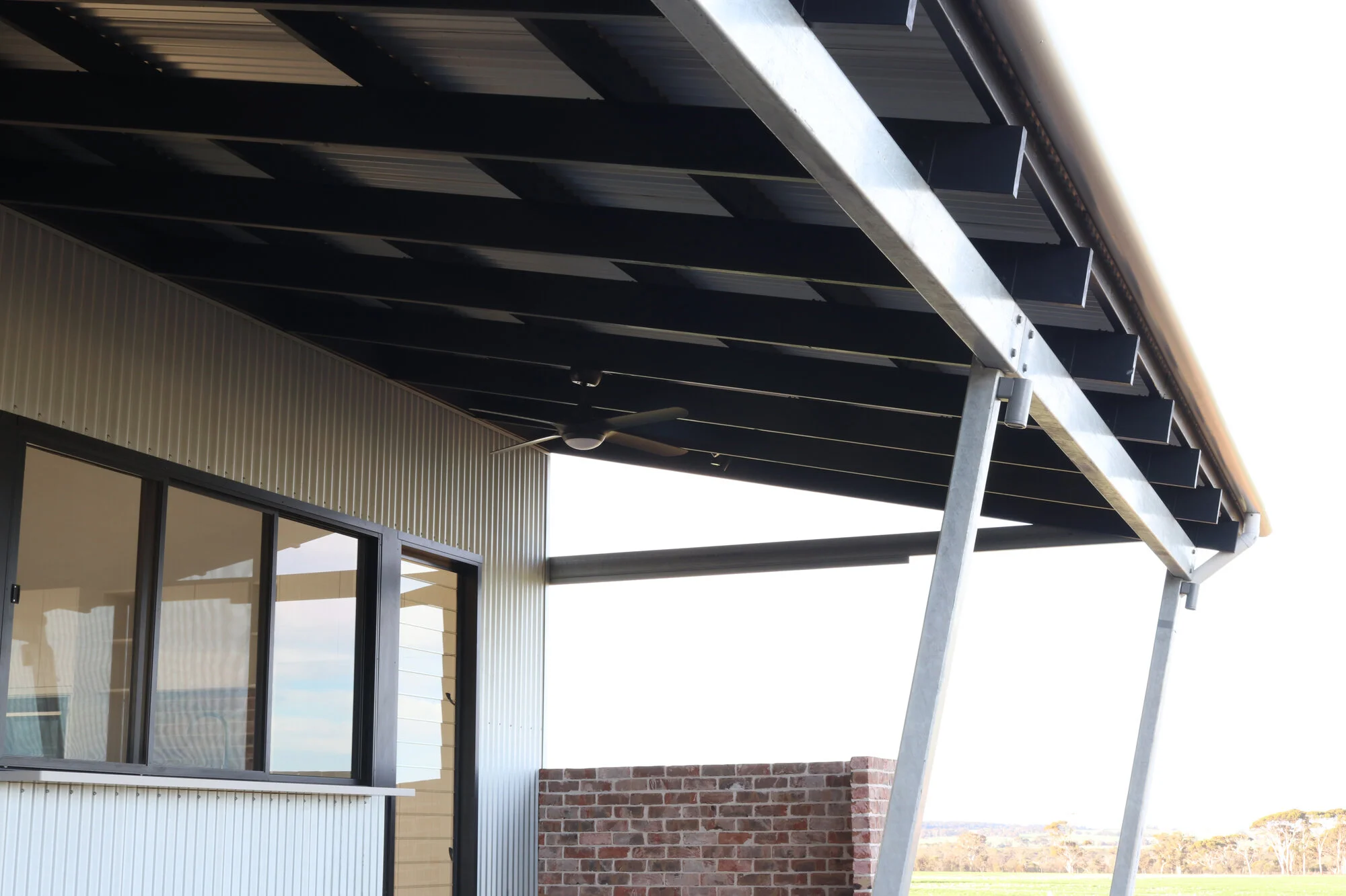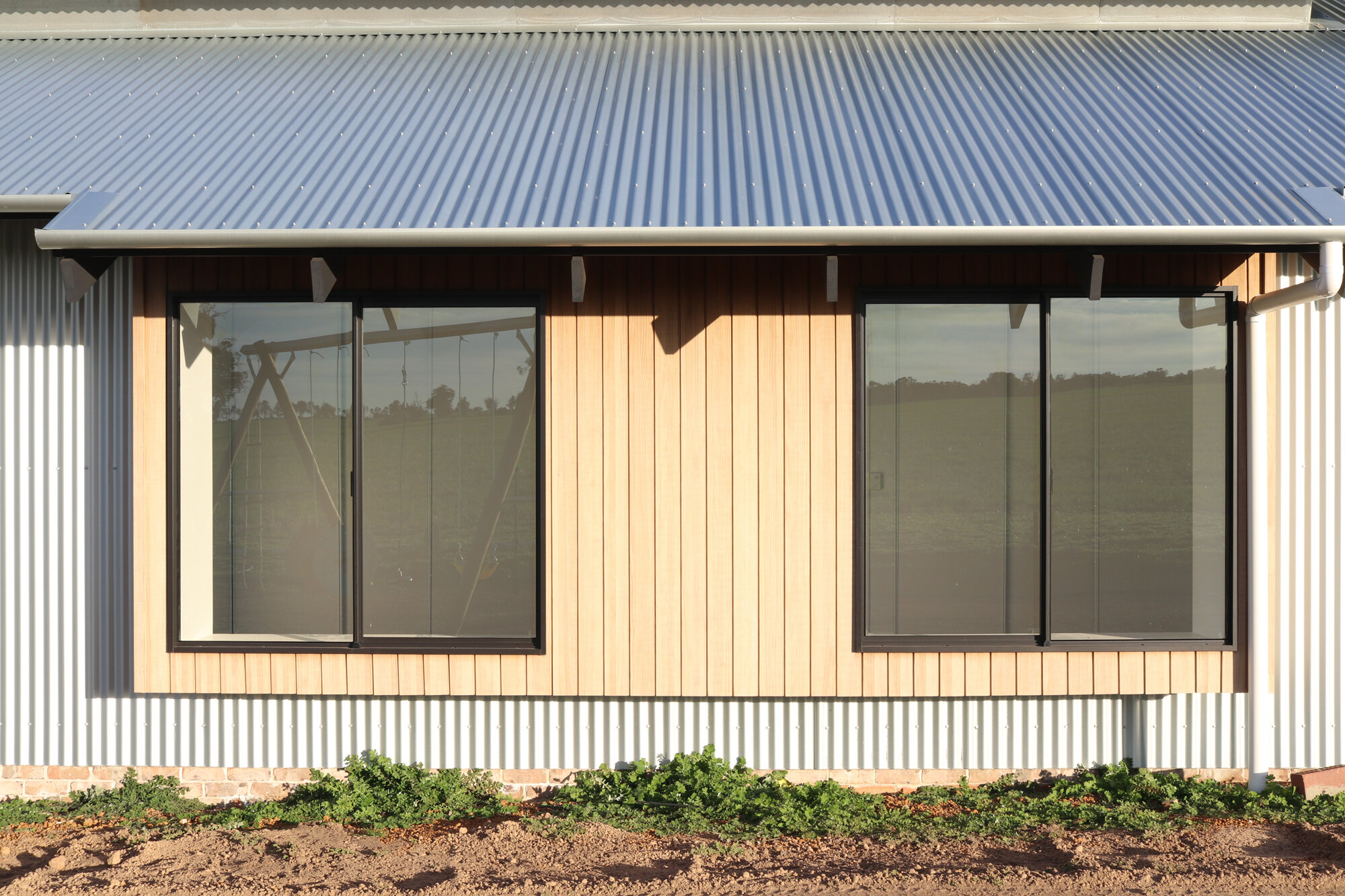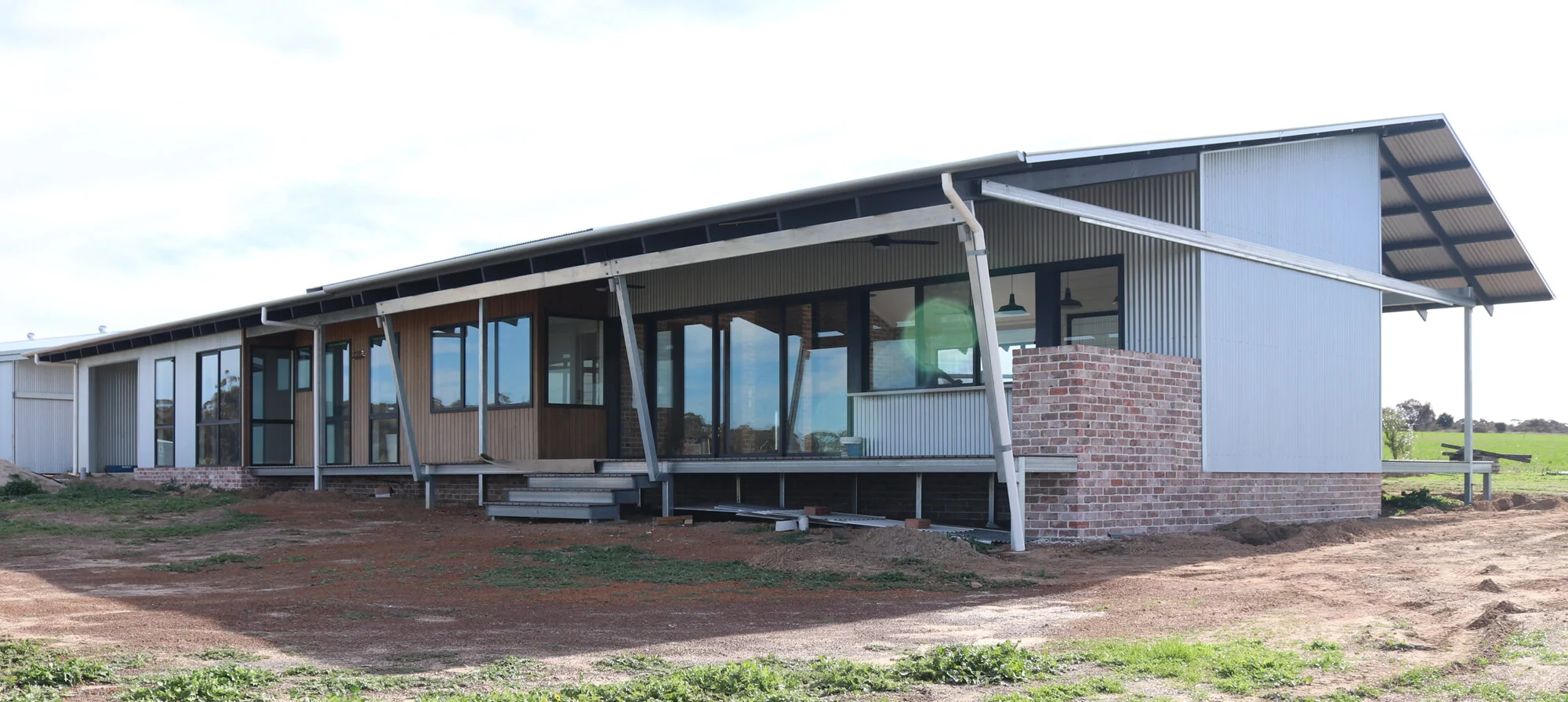Materials and finishes have been selected to echo the old agricultural buildings elsewhere on the property. Rustic elements such as recycled brick and timber provide warmth & contrast next to the zincalume cladding of the main house.